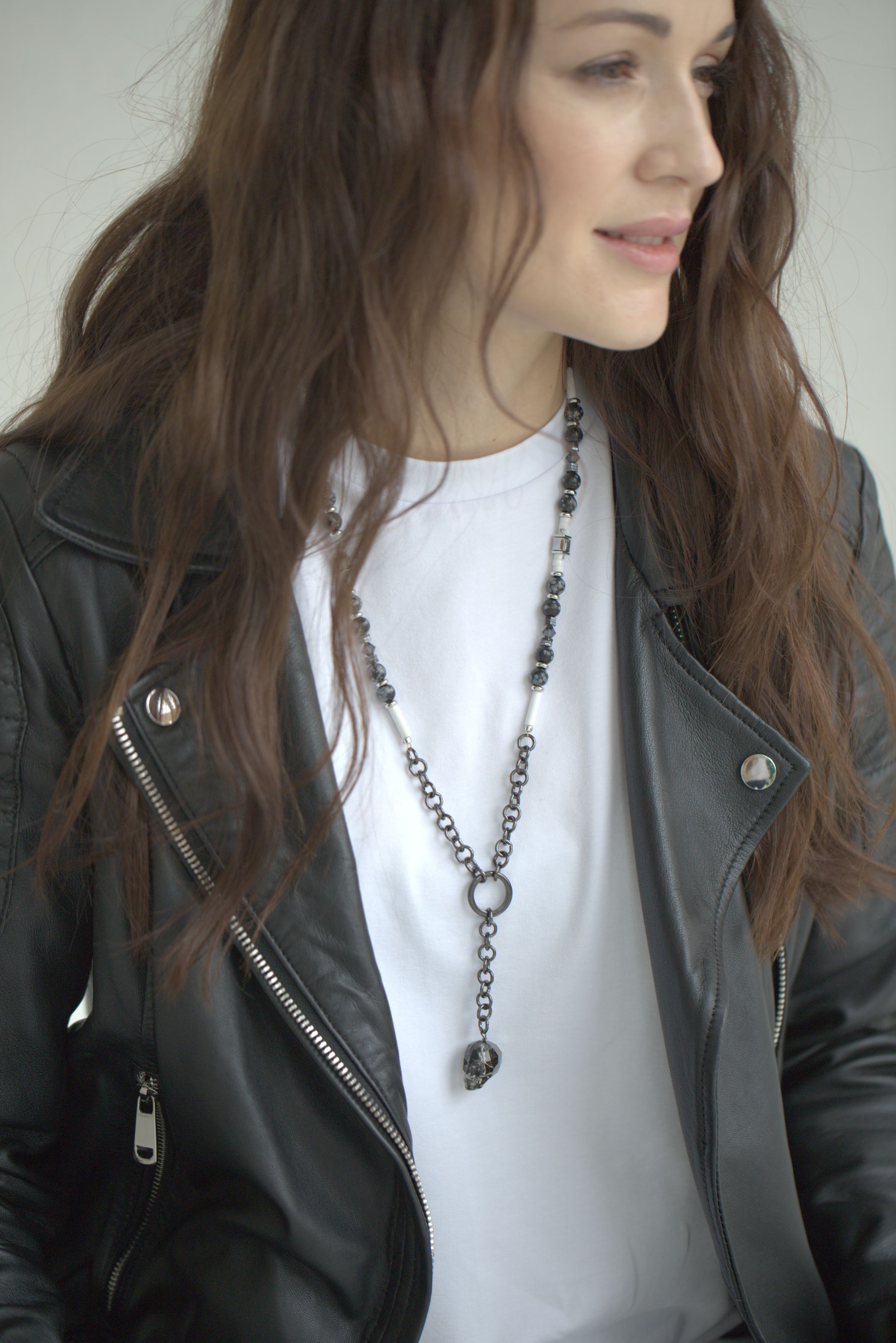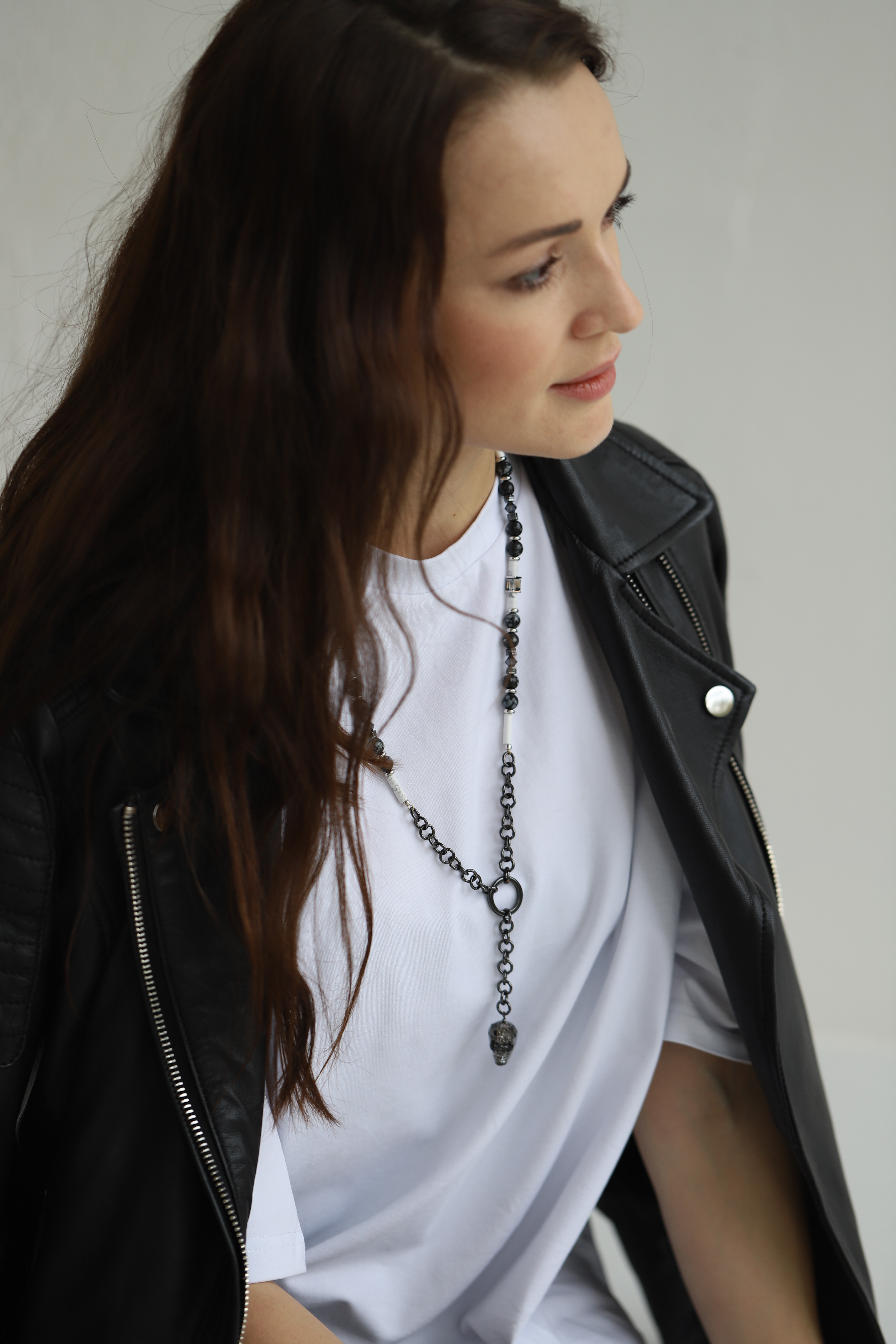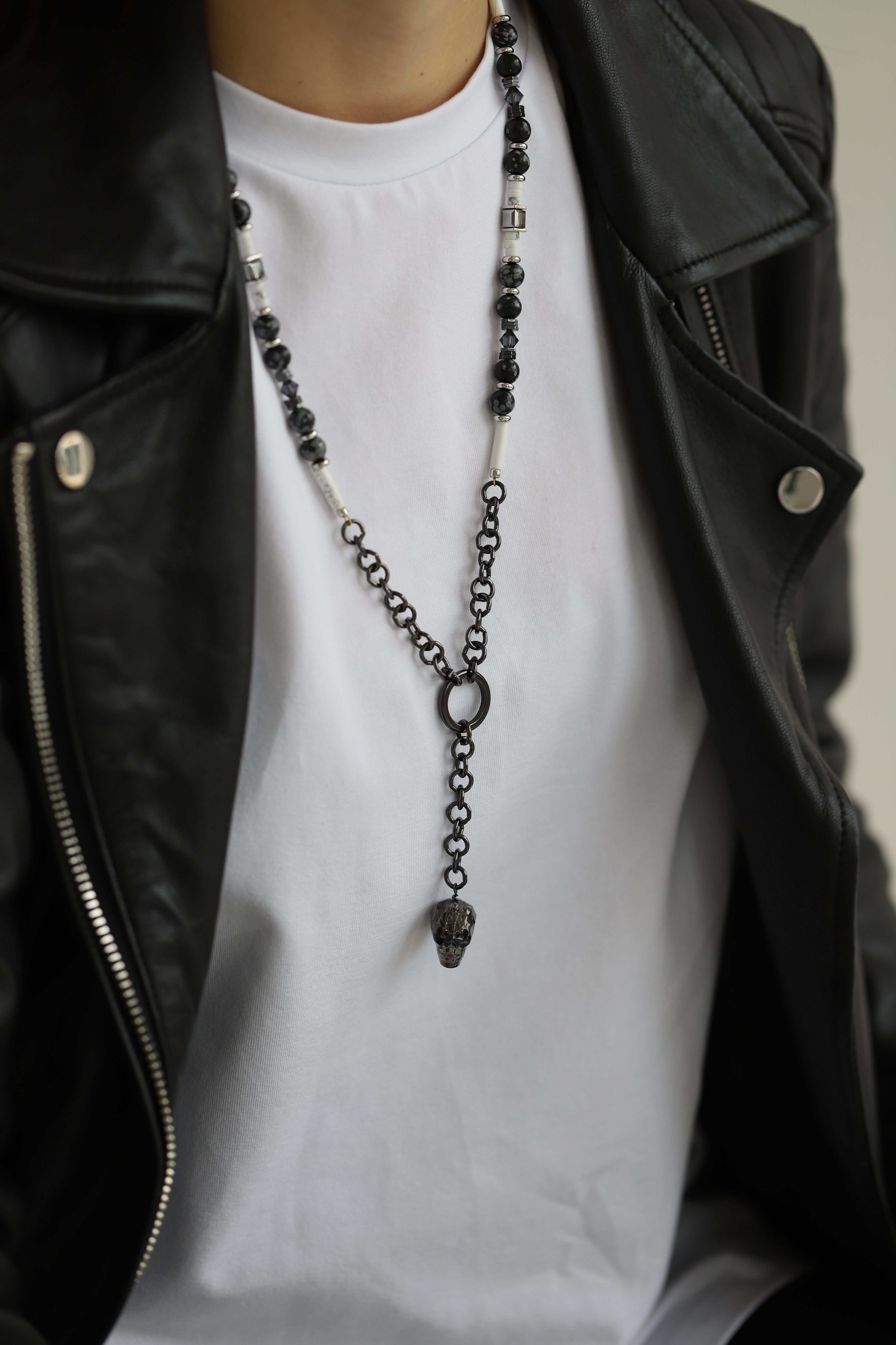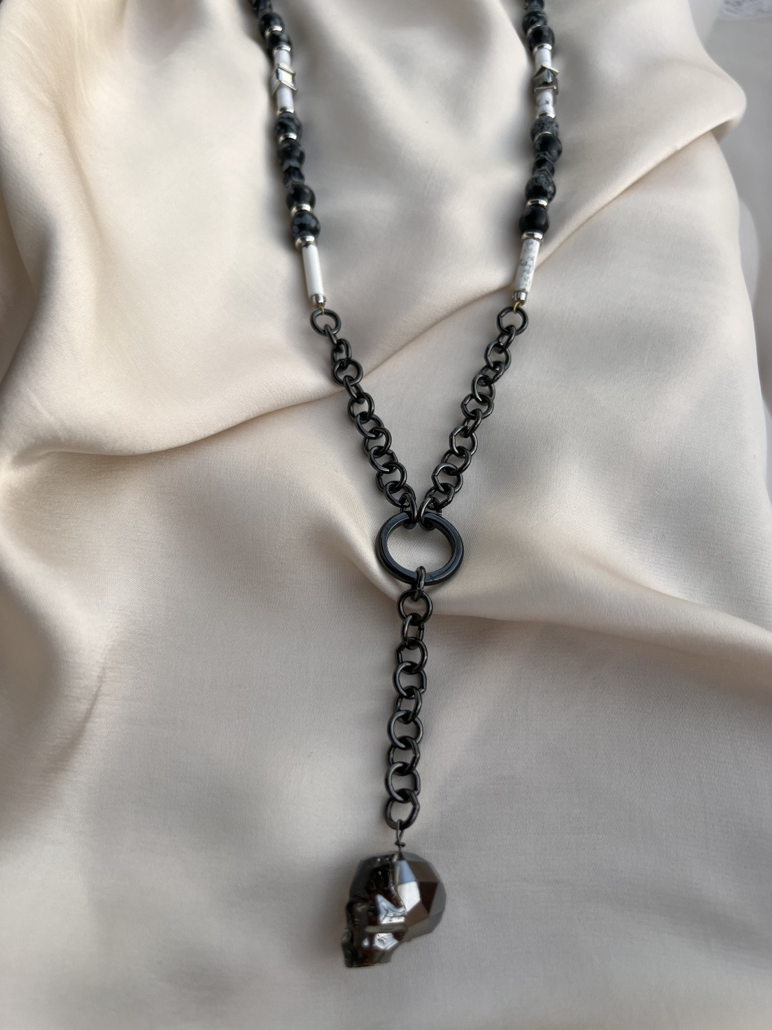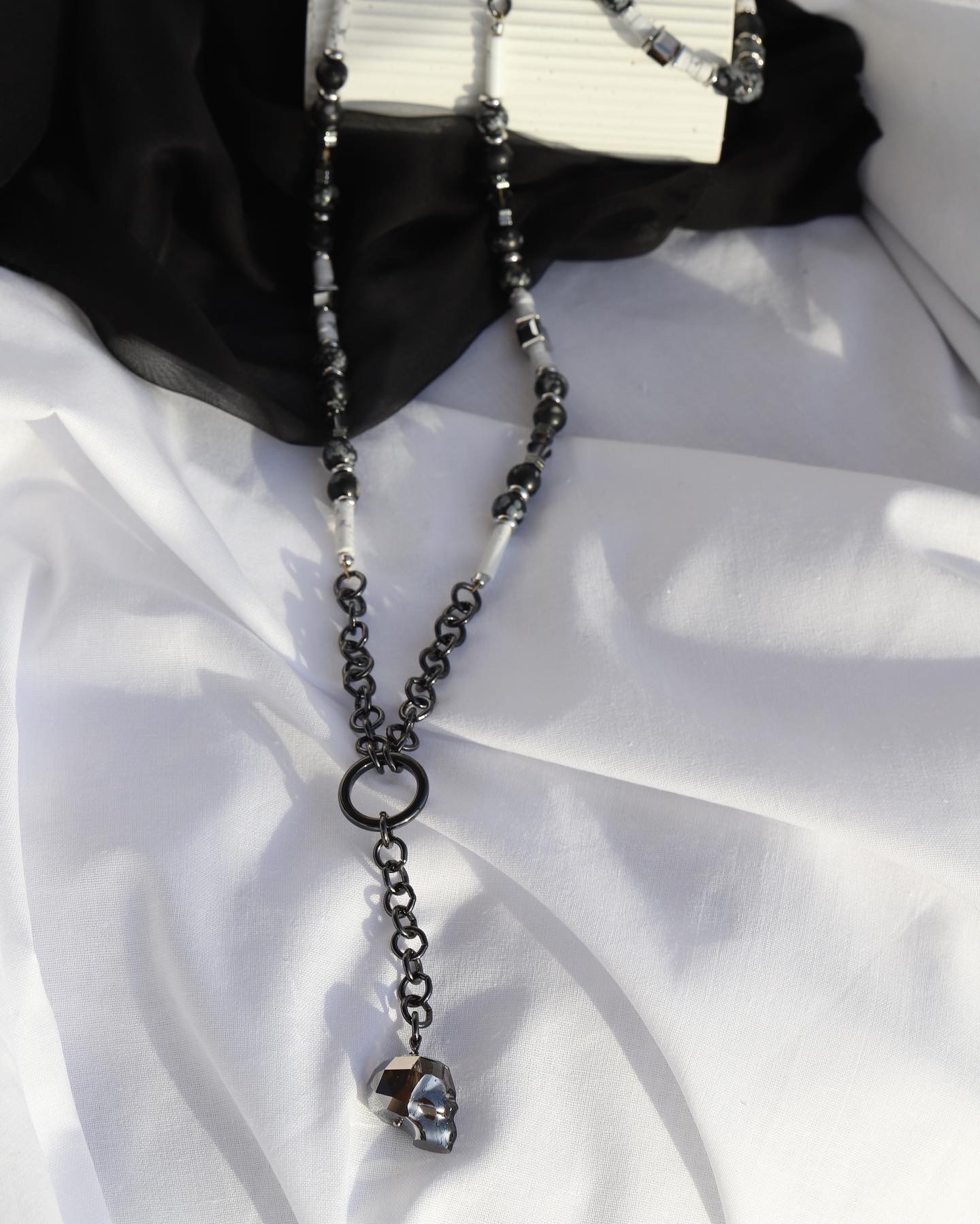 Снежный Обсидиан, Кахолонг, кристаллы Сваровски (Swarovski), Гематит. |