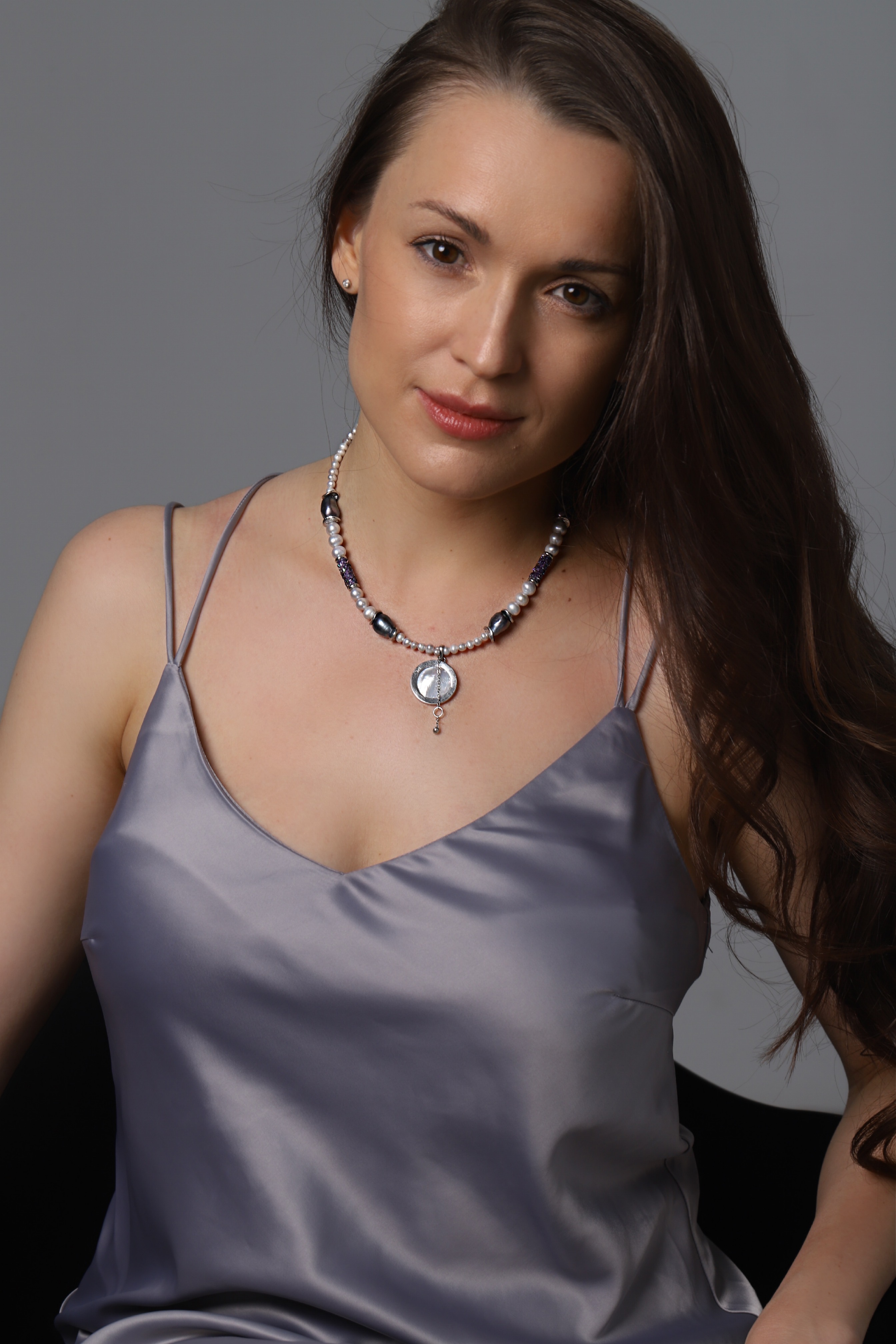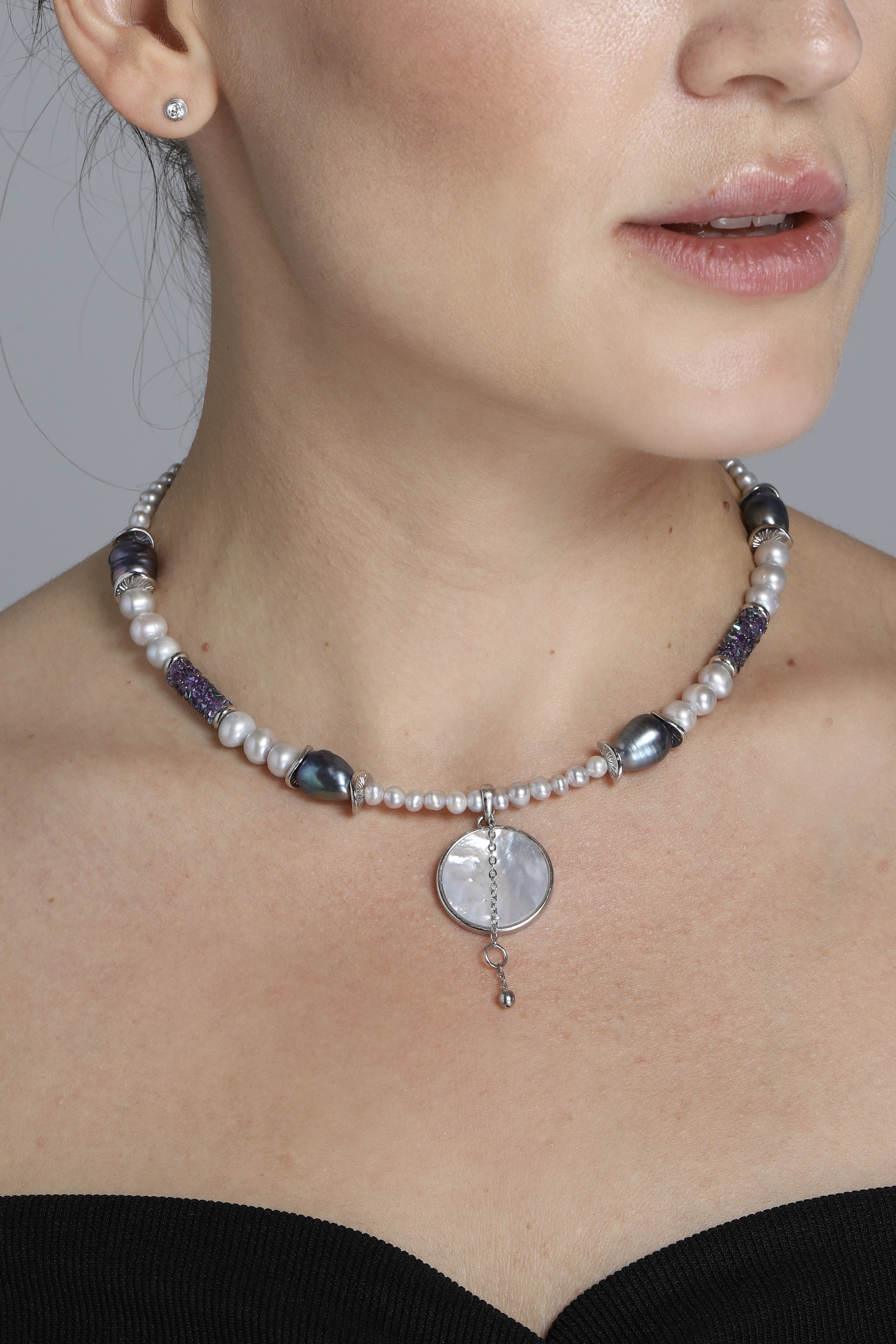 Серый жемчуг 6 мм и 3 мм. Кристалл Сваровски (Swarovski). Черный жемчуг 12 мм.